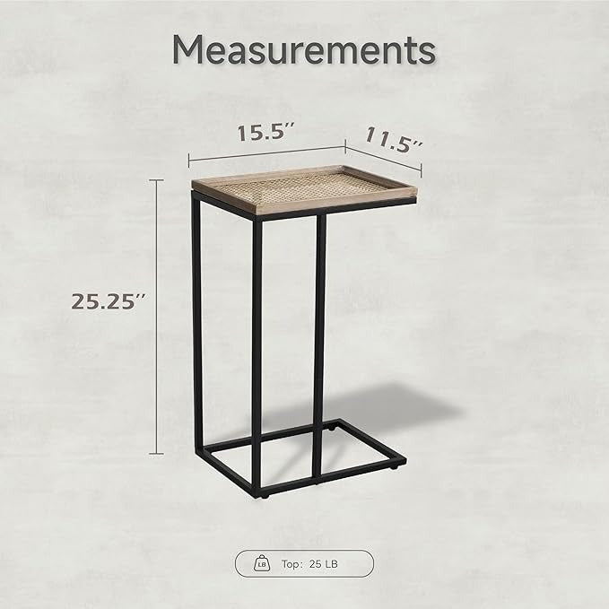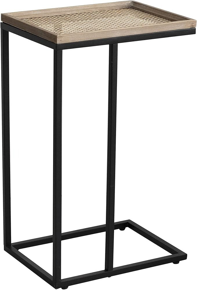 Farmhouse C-Shaped Couch End Table | Rustic Snack Side Table with Distressed Rattan Tray Top
