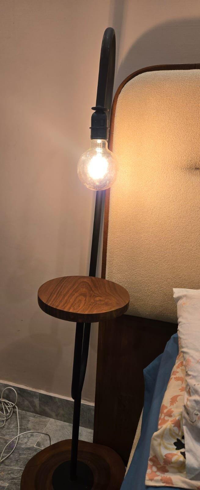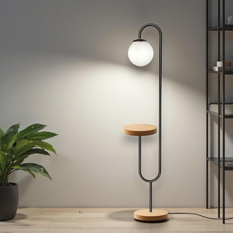 This handmade floor lamp combines a frosted glass globe with a slender metal frame and warm oak details. The integrated round shelf provides a useful space for books or glasses, while the globe casts a soft, bright light—perfect for living rooms, bedrooms, and reading nooks.