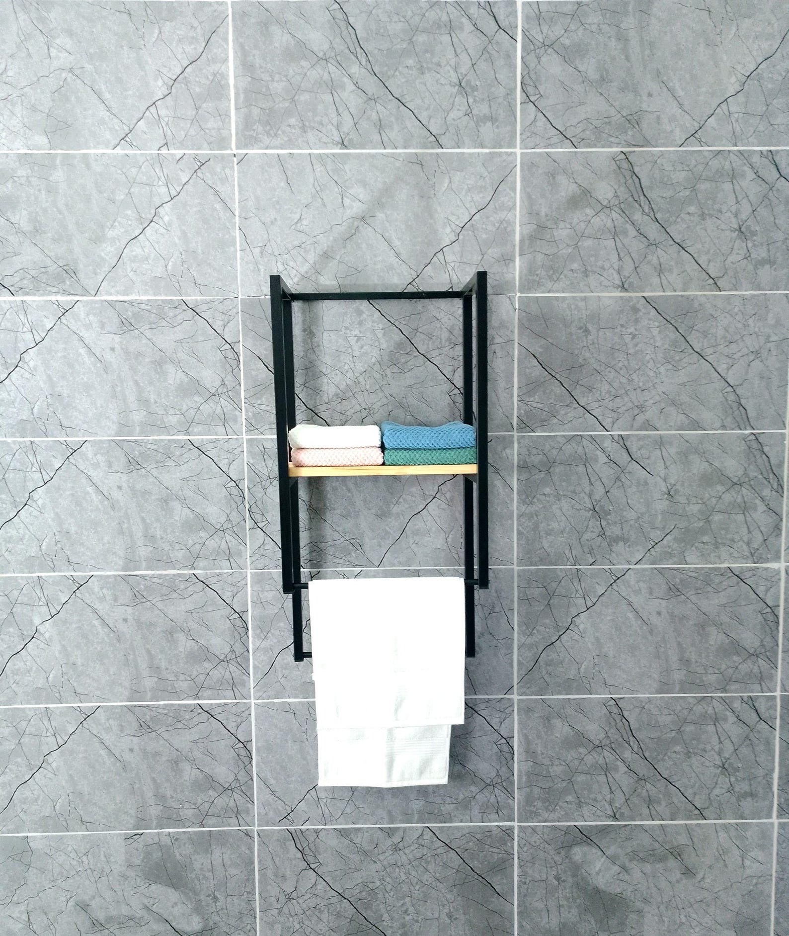 Looking for a simple way to upgrade your bathroom while keeping it organized? This sleek, wall-mounted towel rack offers the perfect balance between minimalist design and everyday functionality. With its simple metal frame and natural wood shelf, it blends beautifully with both modern and industrial decor styles.